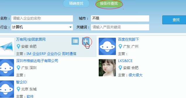 5、如果不记得公司的全名,可以选择按“条件查找”,这时就会出现你们公司,就点击添加就可以