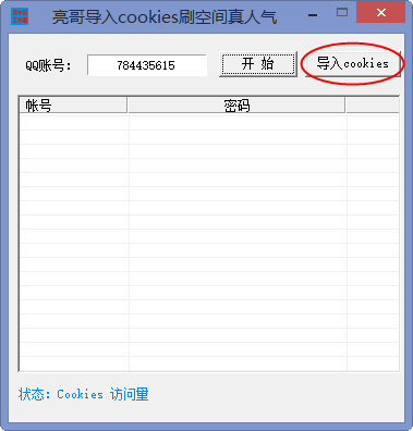亮哥cookies刷空间人气工具是一个绿色免费的QQ空间刷人气软件,软件采用真实的cookies来刷空间人气,所获得的人气是真实有效的。软件无需登录QQ号,只需要导入cookies就可以快速刷空间人气了。