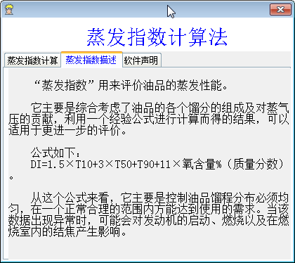 蒸发指数计算法是一款功能非常强大且绿色免费的计算软件,主要是计算油品的蒸发性能的计算工具,你值得拥有!