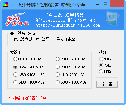 永红分辨率智能设置软件,能够自动设置电脑分辨率工具,不论你使用的是任何显示器,本软件都会根据你的显示器智能判断,自动设置最佳屏幕分辨率、刷新频率和颜色质量等,使你的显示器达到最佳显示效果。