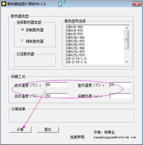 3、输入采暖工况数值,可计算出公式和散热器的片数