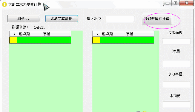 读取文本数据,输入水位,提取数值并计算出过水面积、湿周、水力半径、水面宽。