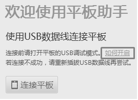请先启动平板助手,然后打开平板电脑中的USB调试模式,如何打开USB调试模式?请在平板助手首页中,点击“如何开启”即可查看USB调试模式的打开办法。