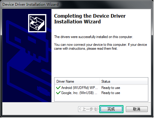 驱动程序安装完成,点击“完成”操作关闭驱动程序安装引导。