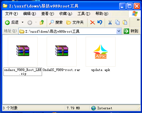 root工具使用教程压缩包中包含Update.apk、ondaos_V989_XXX.zip、使用说明,进行解压。