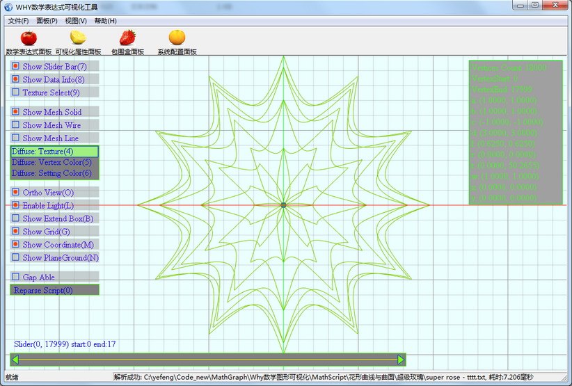 2、在文件夹” MathScript”中,提供了500个以上已经写好的数学表达式脚本文件.将数学脚本文件拖入到主界面中,即显示其图形.亦可以通过菜单项打开脚本文件。
