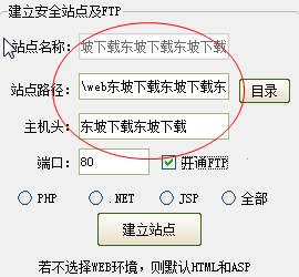 3、建立站点的名称、路径、端口等属于必填项,开通FTP为选择项,而开通网站的环境如果不选择给出的那几个,则默认为html和asp;