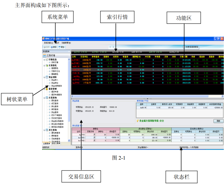 交易终端向操作用户提供参与交易的人机交互界面,操作用户可通过【理财门户贵金属交易客户端】进行上海黄金交易所各挂牌产品的委托交易,并查询各类信息。