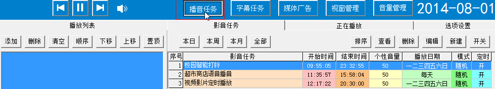 3、定时播放任务支持顺序播放、循环播放与随机播放,支持闲时播放预设媒体广告内容。