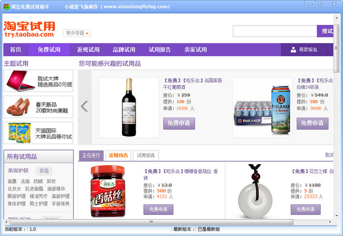 淘宝免费试用助手是一款帮助淘宝试客快速申请到淘宝宝贝试用资格的工具,淘宝免费试用助手支持手动试用和自动试用两种方法,它能够帮你自动完成淘宝免费试用商品的申请流程,让你不用花钱就能试用各类淘宝商品。