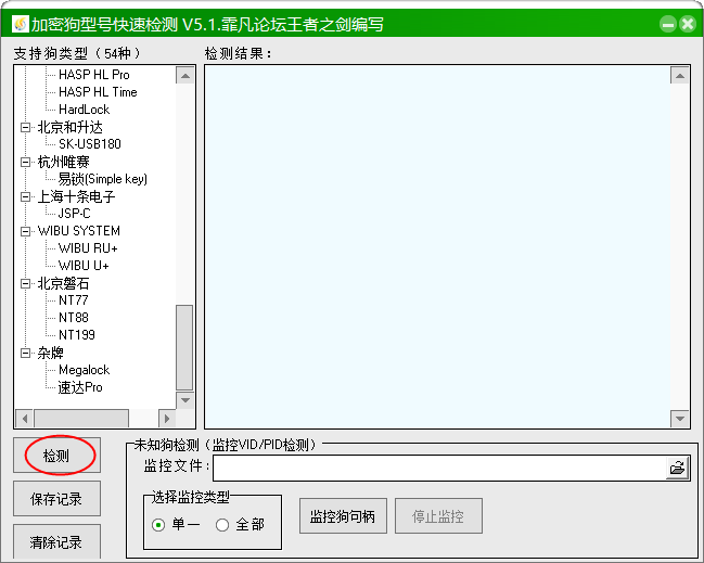 2、点击【检测】按钮即可快速检测出加密狗型号