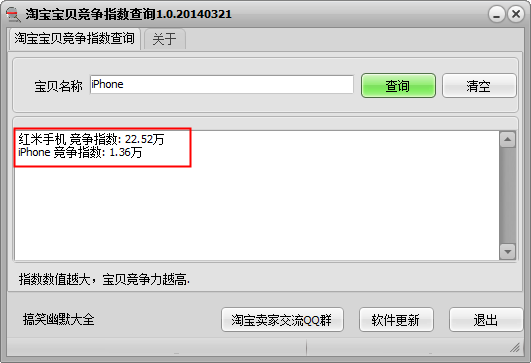 2、点击【查询】按钮就可以查询关键词的竞争指数,指数越大,宝贝竞争力就越高