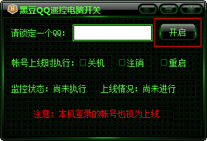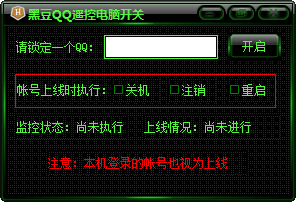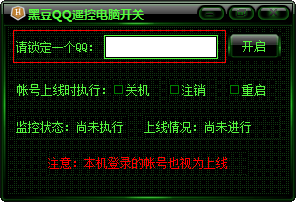 平时大家在使用电脑的时候需要离开,但是电脑在下载东西或者运行某些程序,不能够关闭,黑豆QQ遥控电脑开关工具能够帮助大家快速的进行远程使用QQ进行电脑的开关机操作,方便快捷,有需要的朋友可以试试。
