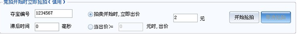 当需要在拍卖一开始就按最高价出价时,可按“开卖抢拍”功能。只要输入夺宝编号和滞后时间,选中“开拍时立即出价”并点击“开卖抢拍”就可在第一时间按最高价出价。