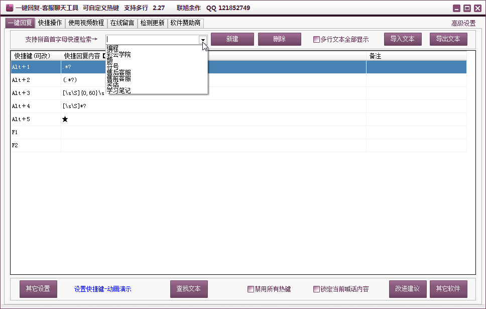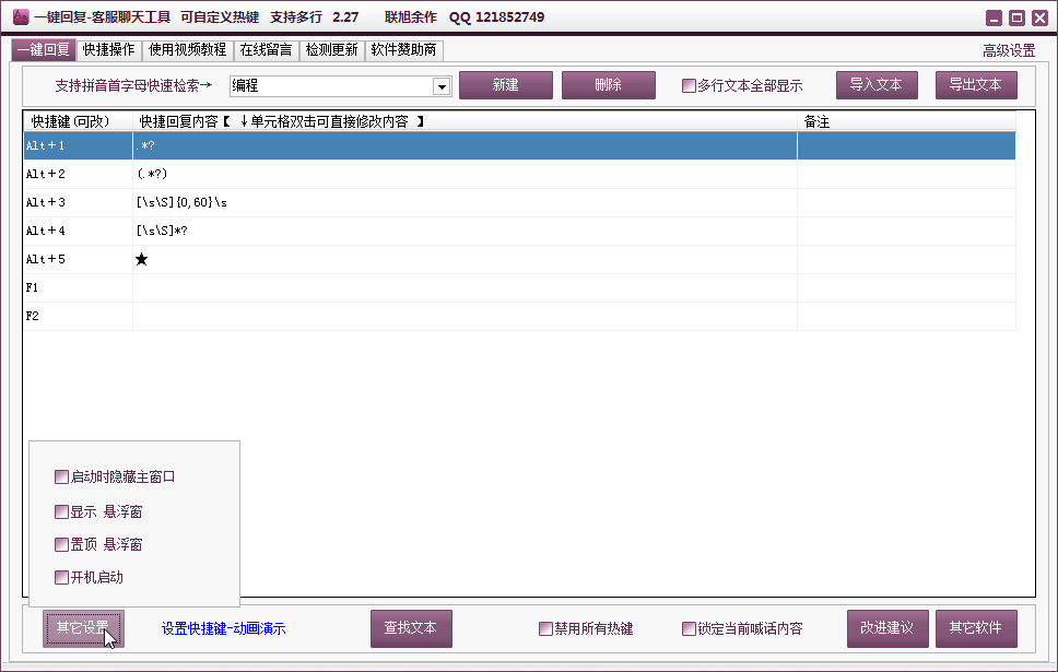一键回复客服聊天工具是一款功能非常强大且绿色免费的软件,能够起到客服聊天一键回复的作用。自定义热键,你值得拥有!