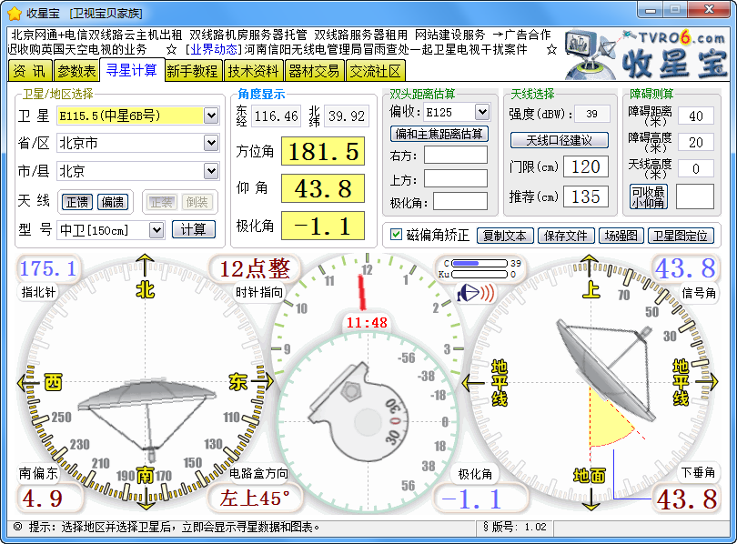 寻星计算:选择地区并选择卫星后,会立即显示寻星数据和图表。
