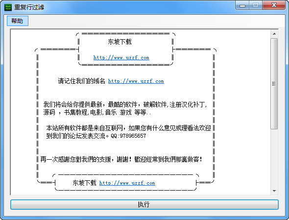 重复行过滤工具是一款简单实用的小工具,可以把文本文档中的重复段落清除掉,功能虽然简单,但用途却非常大。网上下载的txt小说有很多都有重复段落,如果一个一个去修改的话也不知道什么时候能够弄完,所以才会给大家带来这款重复行过滤工具,只要在每一行的段落中有一模一样的文字就可以自动清除,非常方便!