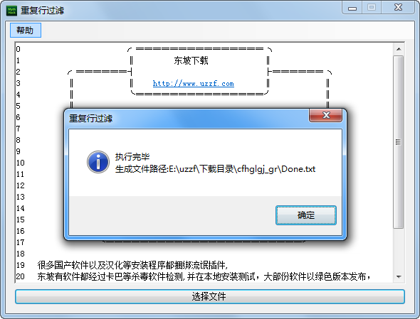 3、这时候点【执行】会在本程序目录下生成一个Done.txt或过滤完的[您选择的文件名].txt