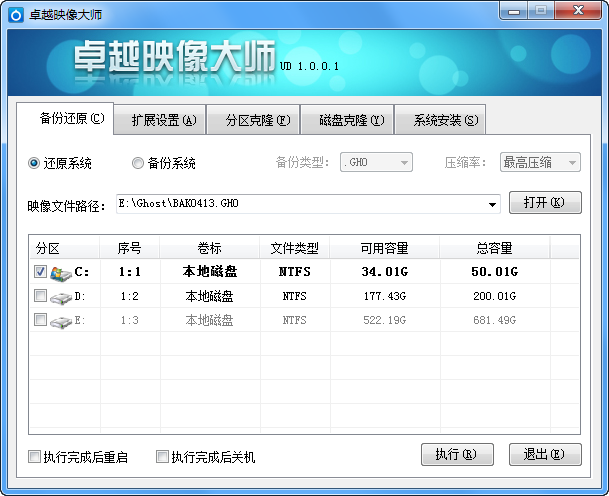 备份还原:和一般的一键还原系统软件用法差不多,先选择要还原的系统镜像文件,然后点击【执行】即可