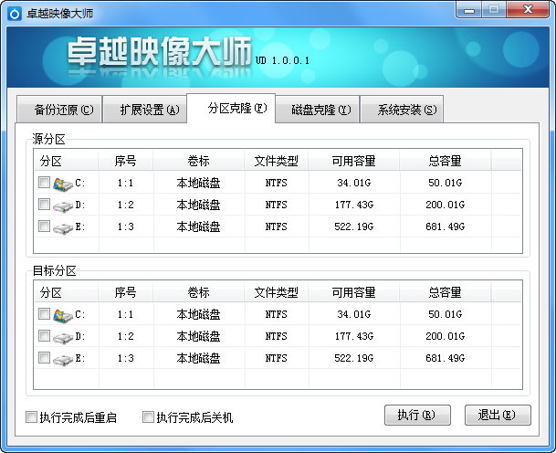 分区克隆:先选择要克隆的分区,然后选择目标分区,点击【执行】即可