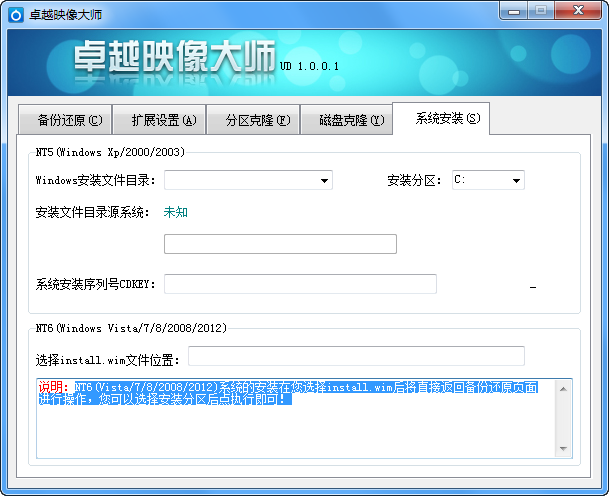 系统安装:NT6(Vista/7/8/2008/2012)系统的安装在您选择install.wim后将直接返回备份还原页面进行操作,您可以选择安装分区后点执行即可!