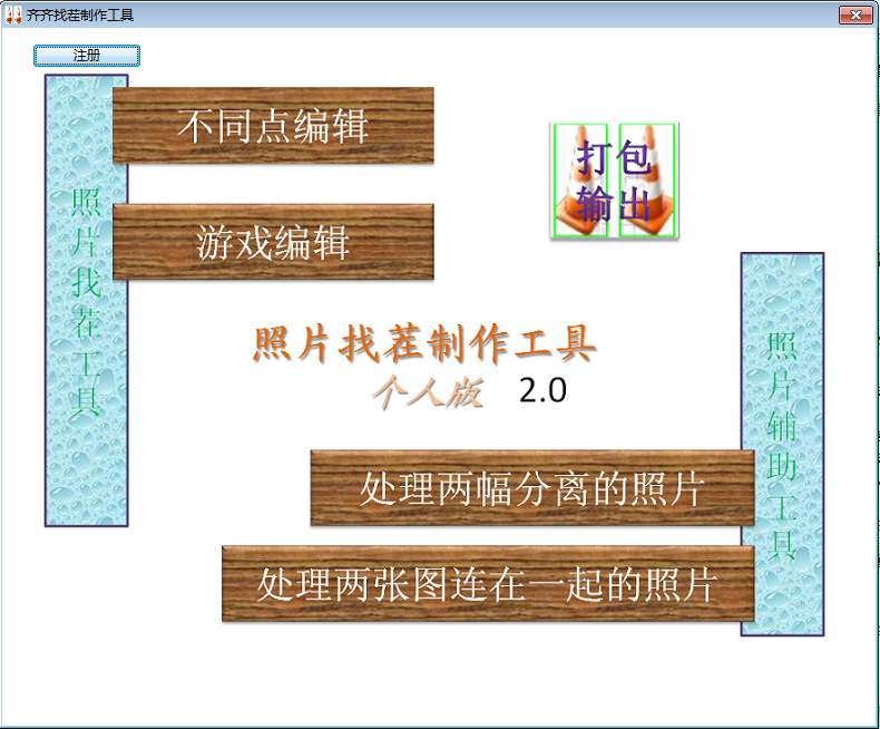 将事先处理好或有意拍摄的两张有不同点的照片放入软件中,通过内置的微调裁剪,自动比较,将不同点手动标出,即可生成“照片找不同”软件。