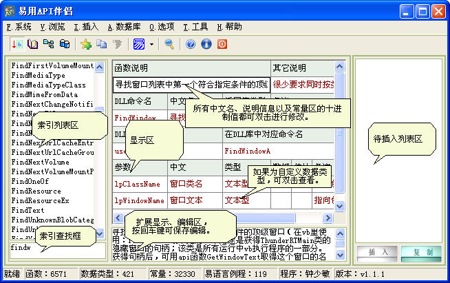 现在学习易语言的人已经越来越多了,在学习和使用易语言的过程中总会或多或少的接触API函数,不过现存的API资料都是为其它语言服务的,所以在易语言使用API函数会有不便。本软件就是专为易语言编写的功能强大的API函数辅助工具,使用方便,有中文说明,数据齐全,已经收集有函数6570个,数据类型419个,常量32000多个。