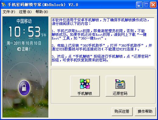 有了以上的准备后,即现在是一台已获得ROOT权限的安卓手机,并已通过USB数据线,“360手机助手”连接成功,接下来就可利用“手机密码解锁专家(MbUnlock)”这个工具进行轻松解锁。“手机密码解锁专家(MbUnlock)”运行界面如下图。本软件仅有二个功能按钮,点“手机解锁”按钮即