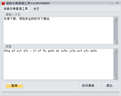 拼音字典查询工具是一个绿色无广告的拼音学习软件,该软件能够根据你所输入的中文,输出相应的拼音,特别适合那些刚学习拼音的用户。它可以帮你快速了解每一个字的发音标准,支持显示拼音声调。
