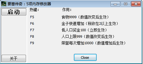 要塞传奇五项修改器是一筐功能非常强大且绿色免费的辅助修改软件,提供食物9999、金子快速增加等实用功能,能让你有不一样的游戏体验,你值得拥有!