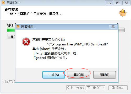 如果用户,点击确定按钮,如图出现以下情况。该原因是因为用户的IE没有关闭,造成文件无法写入,需要用户手动关闭IE,安装才可以继续进行