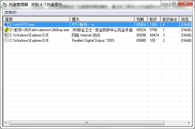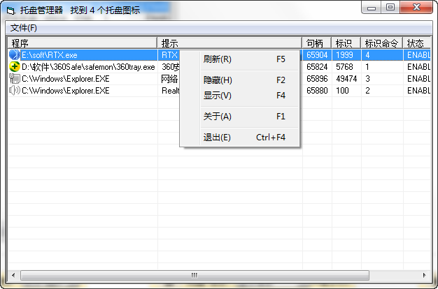 托盘管理器是一款系统托盘图标管理器,很多软件最小化后会直接在桌面右下角显示一个小的图标,但是如果图标多了会显得非常的拥挤,通过本工具可以对托盘图标进行显示/隐藏操作,可以有效的自定义管理托盘图标。