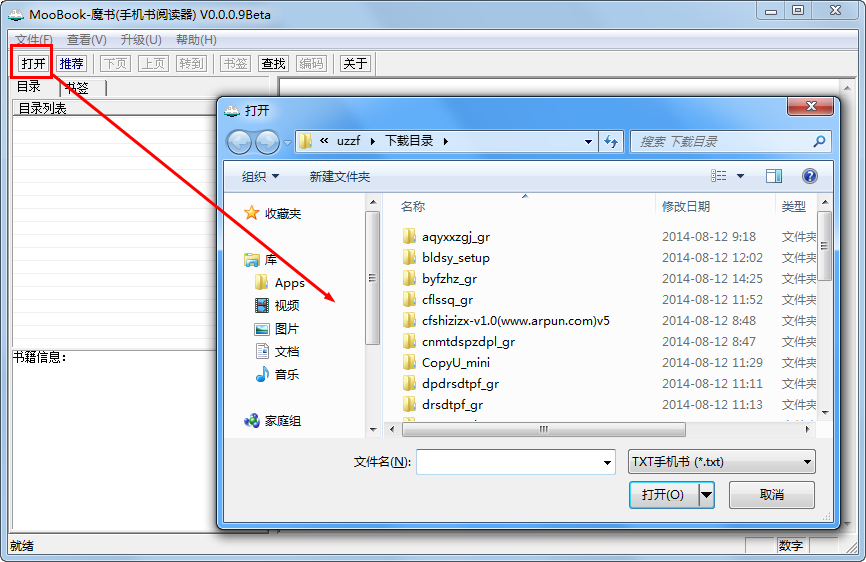 1、启动软件后,点击【打开】选择要阅读的小说文件