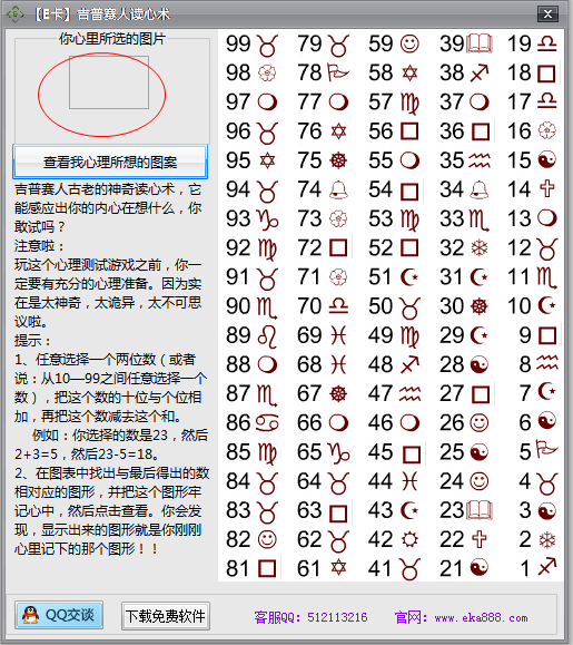 E卡吉普赛人读心术是一款很神奇的软件,能够读懂你的思想,只要你按它的规则去做,你会惊讶,你的一切它都会知道,快来试试吧!