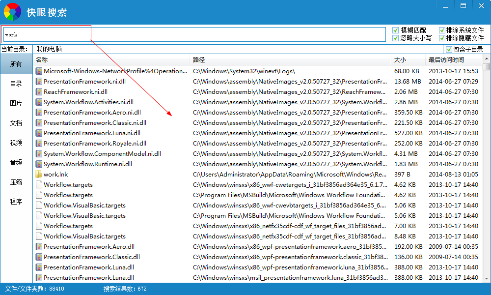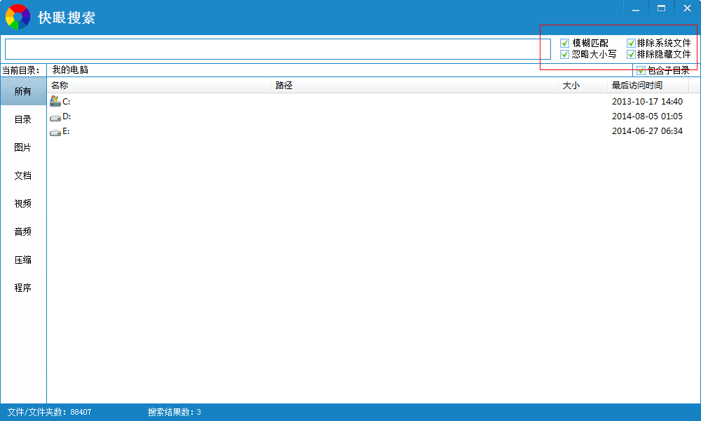 快眼搜索是一款快速文件搜索软件,电脑系统自带的搜索工具有时候不是特别的好用,不能够进行分类查询,本工具支持各种分类查询,搜索速度非常的快,支持各种搜索,非常的便捷实用。