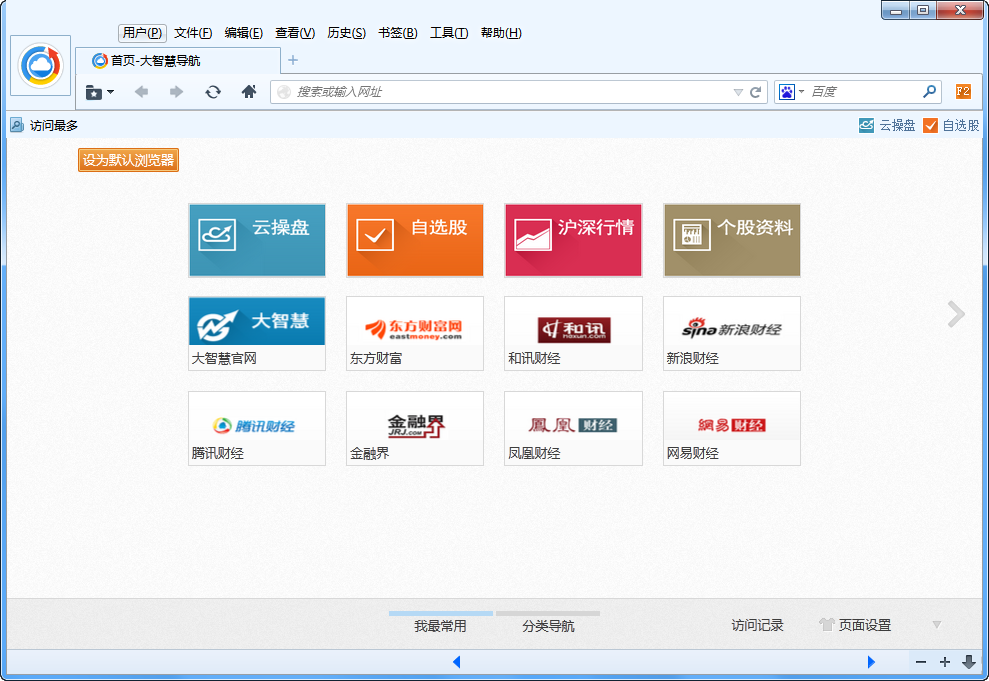 2、大智慧金融浏览器默认启动界面为九宫格界面,你可以直接点击查看行情、自选股以及一些金融网站