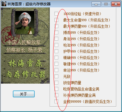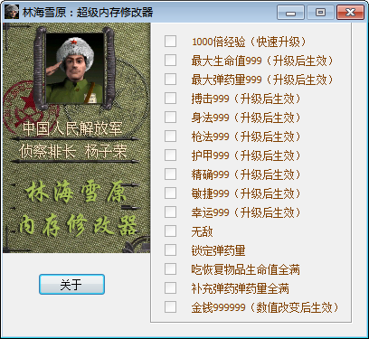 林海雪原游戏修改器集经验、生命值、弹药量、搏击、身法、枪法、护甲、精确、敏捷、幸运、无敌、金钱等多种功能于一身。