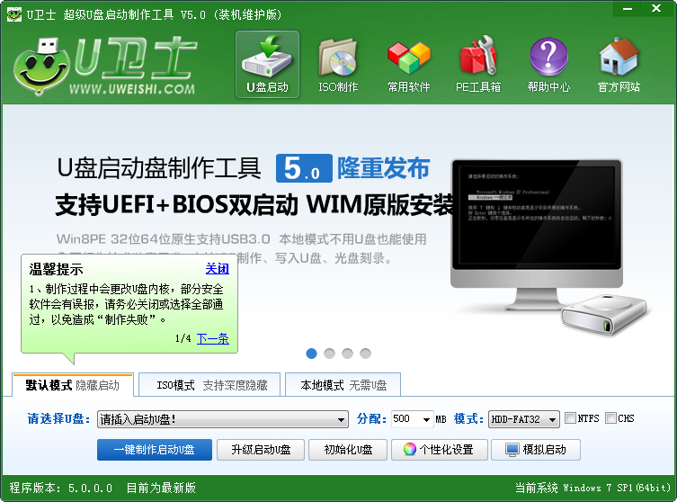 第二步:用U卫士U盘装系统软件制作启动U盘