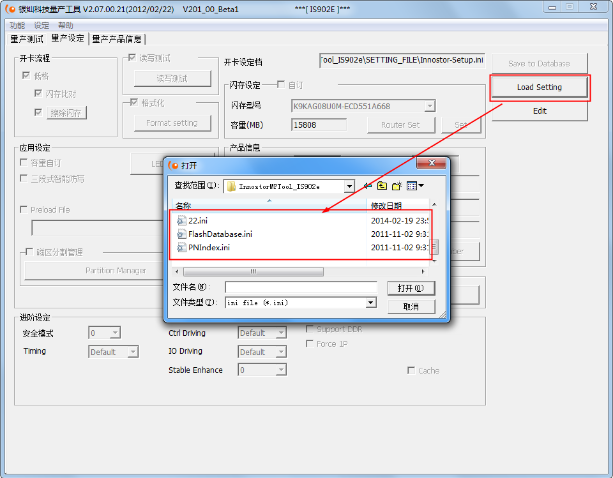 2、点击【量产设定】,然后点击【载入设定档】选择ini文件并载入
