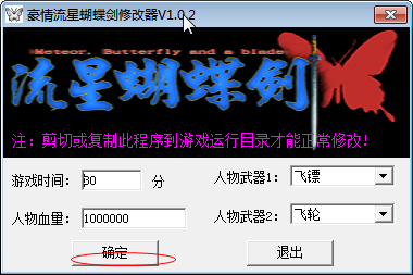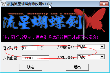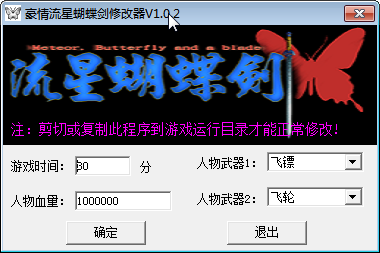 豪情流星蝴蝶剑修改器是一款功能非常强大且绿色免费的辅助修改工具,提供武器生命修改器、修改游戏时间等实用功能,让你体验不一样的游戏魅力,操作非常的简单,快来试试