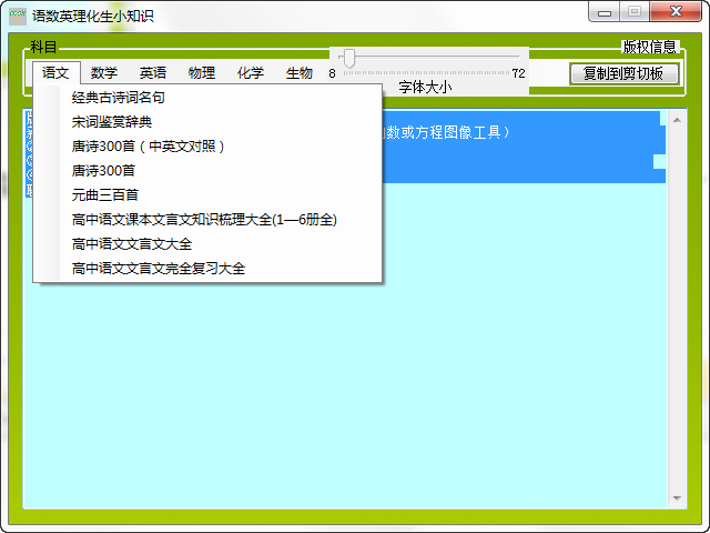 你可以简单查看一些知识点,界面清新简洁,内容丰富其中内容有高中文言文,著名古诗词,数学中小学公式,英语常用口语四六级词汇等,物理初高中公式,化学初高中公式,生物高中易错点(资源来源于网络分享),包括两个小工具:绘制函数图像与解简单方程工具,安装直接选择路径即可,不会把程序写入注册表,仅占硬盘空间,卸载简单:直接把安装文件夹删除!不要随意修改文件夹内容,否则软件将会弹出错误安装提示!