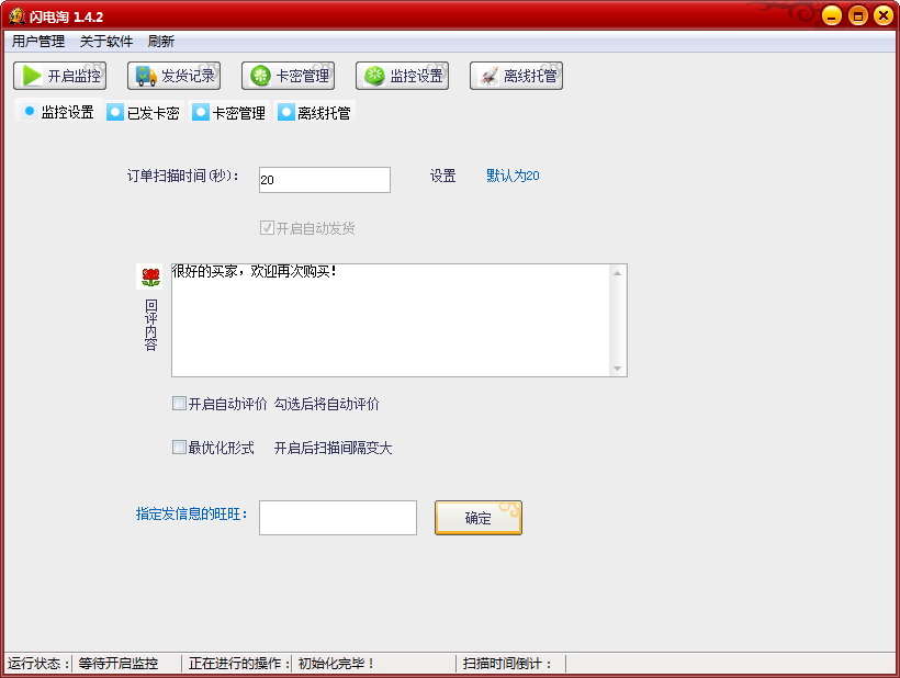 闪电淘是一款绿色免费的淘宝自动发货软件,本软件非常适合那些需要自动发货的淘宝卖家,比如各种卖充值卡、游戏币、激活码的店家,通过本工具能够自动进行发货,省时又省力,非常的便捷,有需要的朋友可以下载试试。