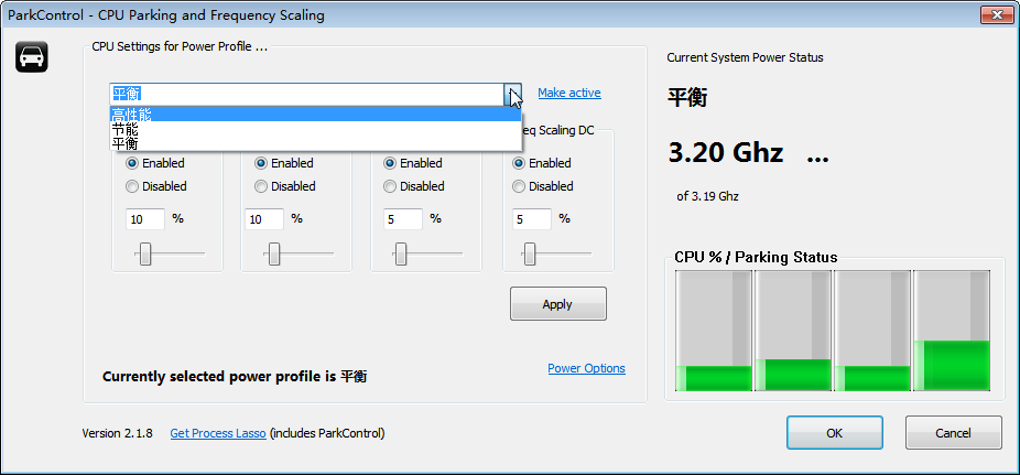 由于 ParkControl 使用的是 Windows 系统自带的配置,所以默认的也就是你在系统电源选项中的配置。在左侧可以调节每一项设置,点击「Apply」对设置进行提交并激活,在下拉菜单中选择一种模式来切换并点击「Make active」来激活。点击下面的「Power Options」回到电源面板中可以还原选项。右侧的区域则是展示当前的 CPU 负载量以及当前 CPU 的工作、停车状态。