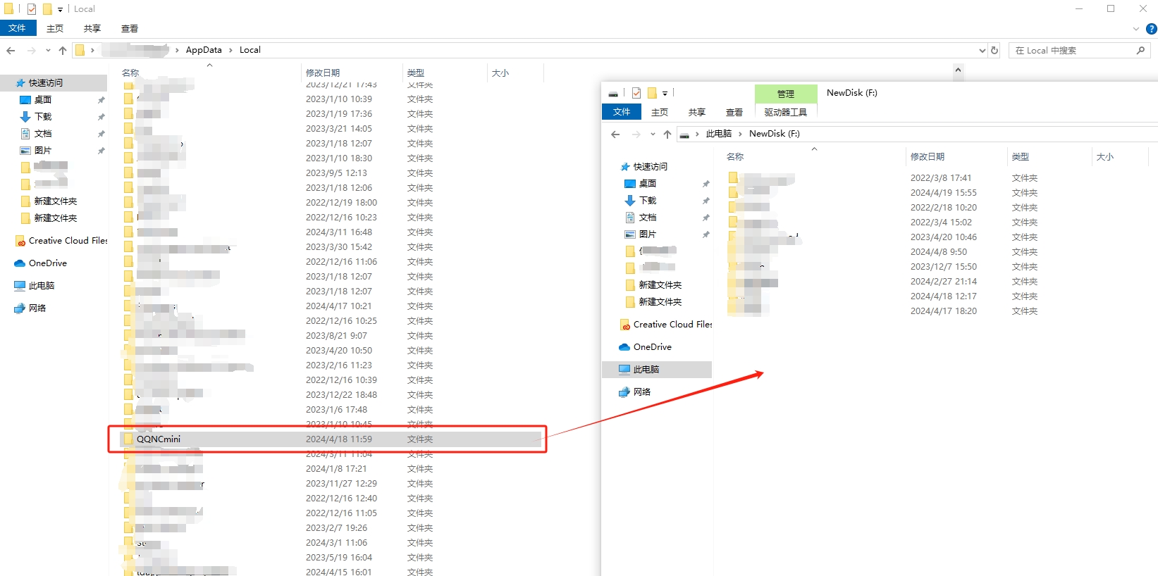 (2)点击上一目录【local】,将整个【QQNCmini】文件夹移动至新的盘中即可完成转移