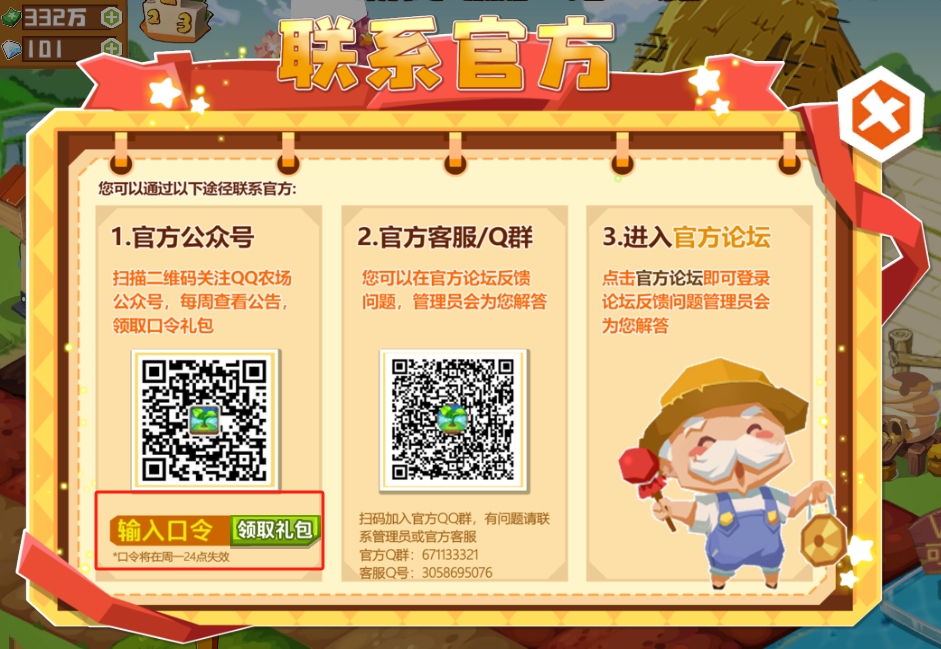 点击主页右上角【联系官方】——输入对应口令即可领取礼包。