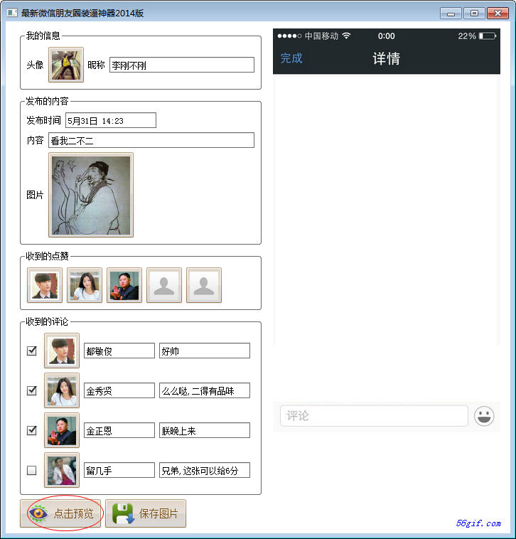 2.可以自定义你的微信头像、名称、内容、图片、发布时间、赞的人、评论等,达到任何你想要修改的结果