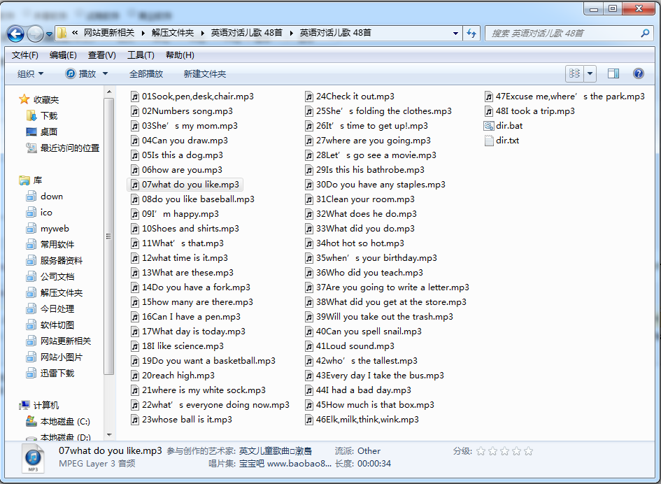 这是一些经典的英文对话儿歌,让您的宝宝在歌声里撑握了日常用语,共有48首。