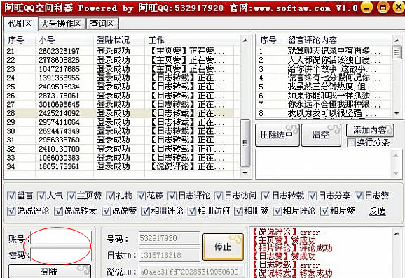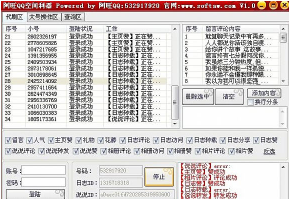 包含留言、访问人数、主页赞、礼物、花藤、日志评论、日志访问、日志转载、日志分享、日志赞、说说评论、说说转发、说说赞、相册评论、相册访问、相册赞、相片赞[18种功能],大号操作区[添加好友,新动态抢评论,赞,等等..]查询区[查询QQ空间信息等一些..] 主页访问刷半天最高可达5W访问数、支持批量登陆QQ,所有的功能都支持批量操作。