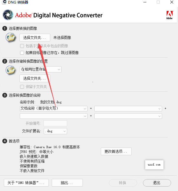设定输出位置:选择转换后的DNG文件保存路径。您可以选择保存在原文件夹、新文件夹或自定义位置。