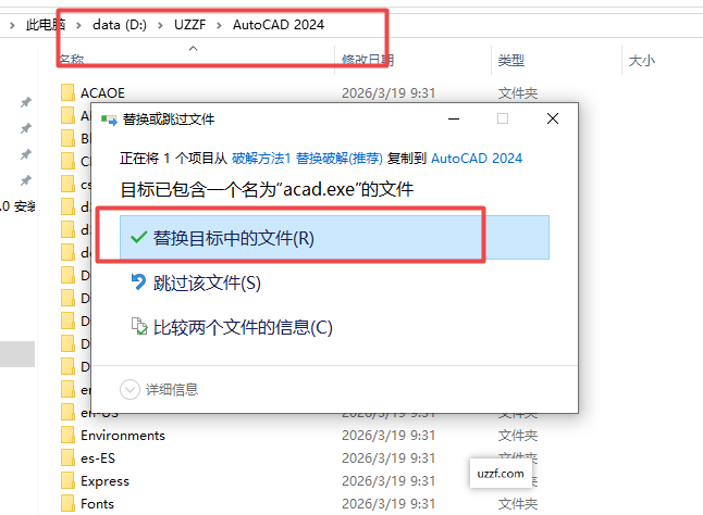 9、然后找到cad2024软件安装所在文件,如下图,然后选择进行替换